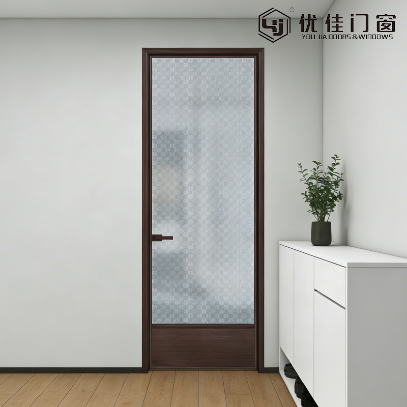 La puerta ofrece beneficios excepcionales en cuanto a estilo y función. Su panel de vidrio texturizado equilibra la difusión de la luz natural y la privacidad, iluminando los espacios y oscureciendo las vistas directas, una ventaja clave sobre las alternativas de puertas corredizas que pueden comprometer el flujo de luz. El rico marco de madera oscura agrega calidez e integridad estructural, mientras que el diseño abatible con bisagras garantiza un acceso suave y sin obstáculos, ideal para áreas donde la instalación de rieles para puertas corredizas no es práctica. El sólido panel inferior mejora el aislamiento acústico, la durabilidad y un acabado pulido, elevando tanto la practicidad como el atractivo visual.